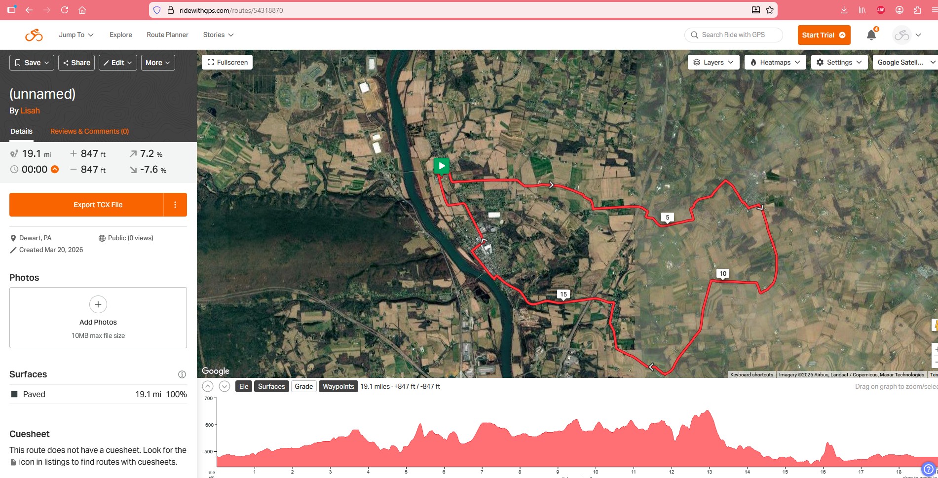 Come join us in Dewart at the playground for this nice 20 mile early season ride. There are porta-potties at the parking lot for before the ride. Here is the link for the course and contour map.